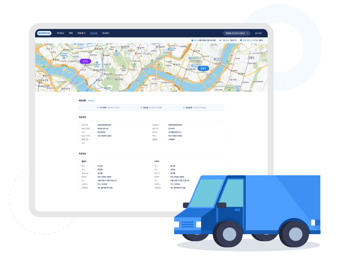 전화가 필요없는 주문 관리용 웹페이지 제공에서부터 실시간 위치 추적 및 사용내역 확인 등 사용자의 업무 효율을 극대화 할 수 있도록 다양한 기능을 지원하고 있습니다. API 제공을 통해 내부 인트라넷, ERP와도 자유롭게 연동이 가능합니다.